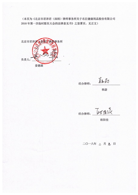 名臣健康用品股份有限公司(以下简称“公司”)2018年第一次临时股东大会(以下简称“本次股东大会”)于201829日下午1330召开,北京市君泽君(深圳)律师事务所(以下简称“本所”)接受公司的委托,指派相关律师(以下简称“本所律师”)出席会议,并依据中国证券监督管理委员会(以下简称“中国证监会”)《上市公司股东大会规则》(以下简称“《股东大会规则》”)的要求发表法律意见并出具本法律意见书。